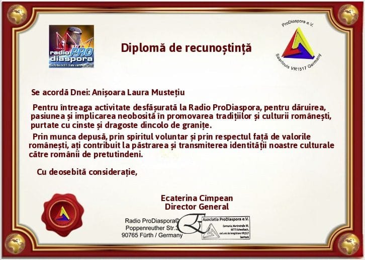 Diploma de excelență și trofeu pentru emisiunile realizate la radio ProDiaspora (2025)